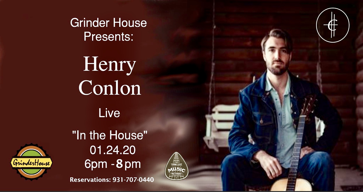 The Grinder House in Crossville, TN proudly presents Henry Conlon playing on January 24, 2020. This singer/songwriter has been performing since he learned to play in guitar in 8th grade. His original songs have brought him many great accolades and he now has is debut album “Home”. His inspiration for this album has been mostly about his own life and observations on the world around him. So, if your staying in one of our beautiful homes or cabins, come on out for a great concert just minutes away. Check out all the details at: http://www.facebook.com where you can obtain the phone number to get your tickets.
